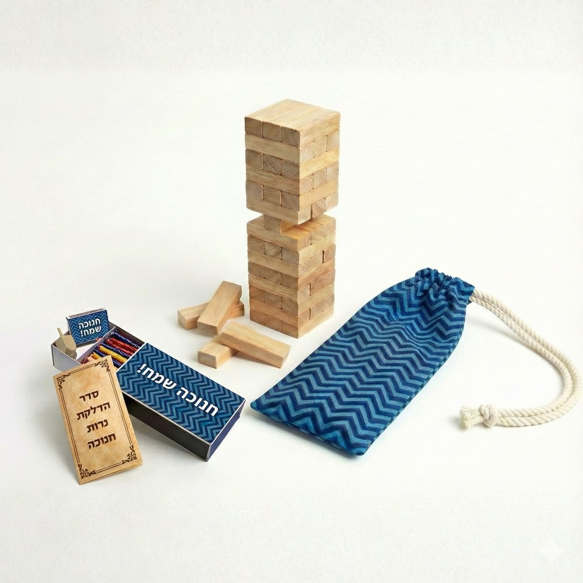 סט חנוכה מושלם: משחק ג'נגה, סט נרות וגפרורים ממותגים בנרתיק בד מעוצב