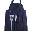 סט ברביקיו מושלם הכולל מזלג, מלקחיים ומרית עשויים ממתכת אל חלד עבה, המסודרים בכיסים נוחים בסינר גדול. הסינר כולל אבזם להתאמת אורך הרצועה לצו