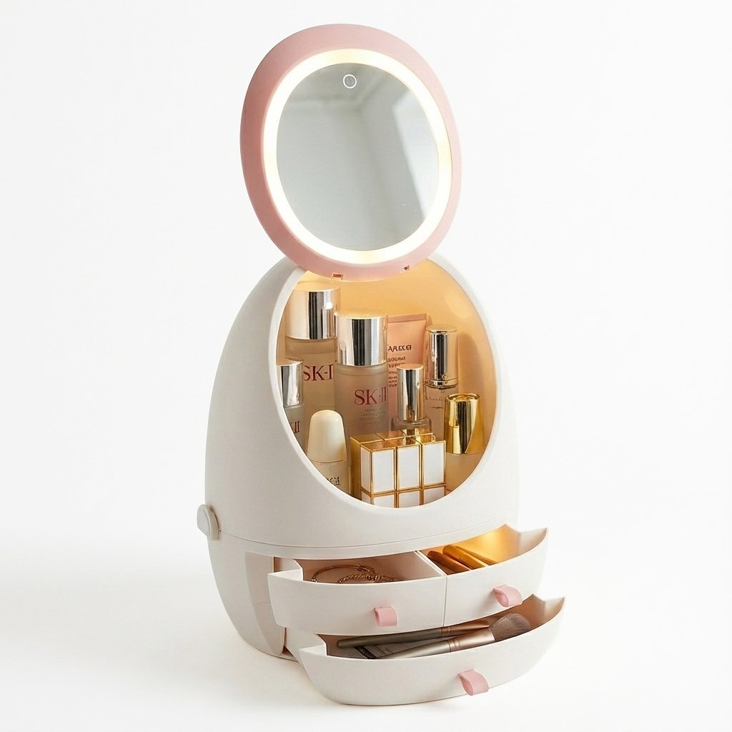 Discover our smart organizer designed for jewelry and beauty products, featuring a stylish mirror and built-in LED lighting for an illuminat