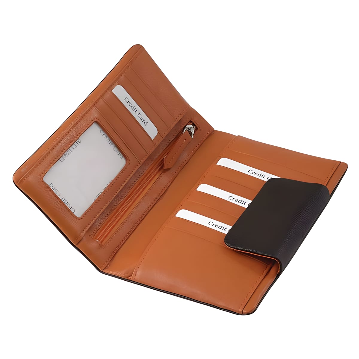 ארנק אשה מעור נאפה תא גדול לשטרות 14 כיסים לכרטיסי אשראי תא פנימי עם רוכסן תא לתמונה / תעודה תא חיצוני עם רוכסן סגירה לחצניות