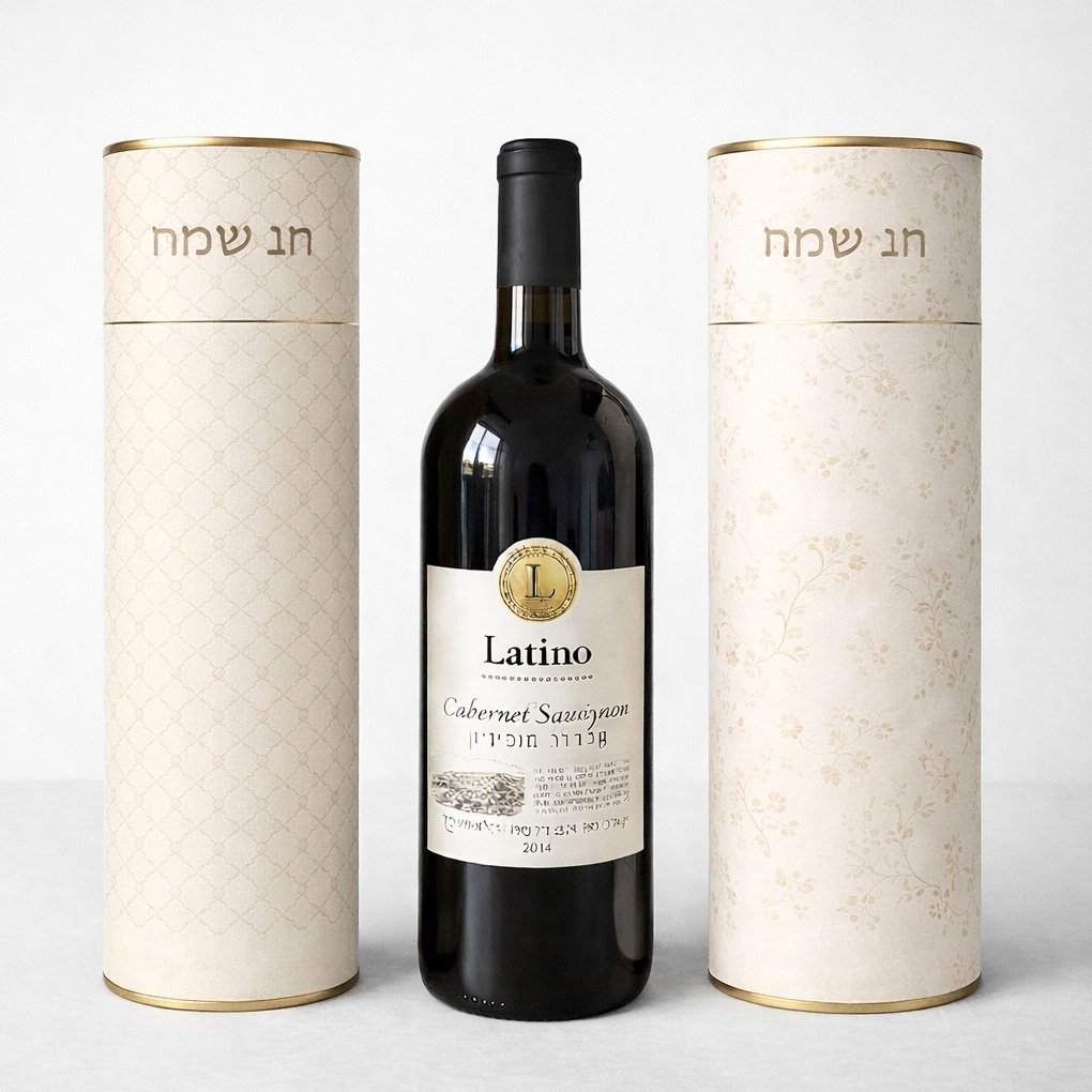 גלו את איכות הבקבוק יין הלטינו, המוצג בצורה אלגנטית באריזת צילנדר חגיגית עם הדפסים. ביחרו מעיצובים קיימים או צרו עיצוב אישי משלכם. מתנה א