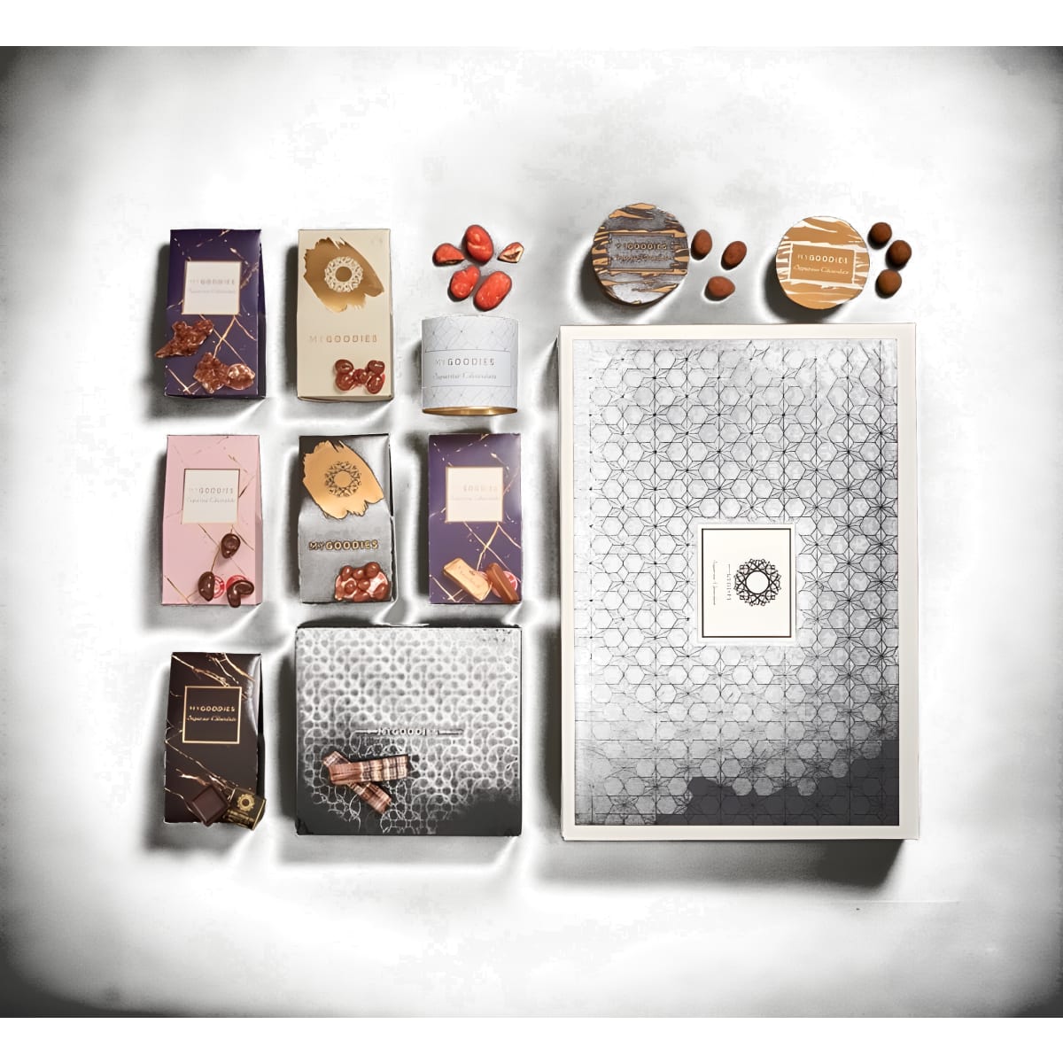 פנינה - קיפולית משוקולד איטלקי משובח, שוקולד "זברה" מריר ולבן, ארגמן - קופסת פח המכילה פקאן מקורמל בעיטוף שוקולד לבן ומובזק באבקת