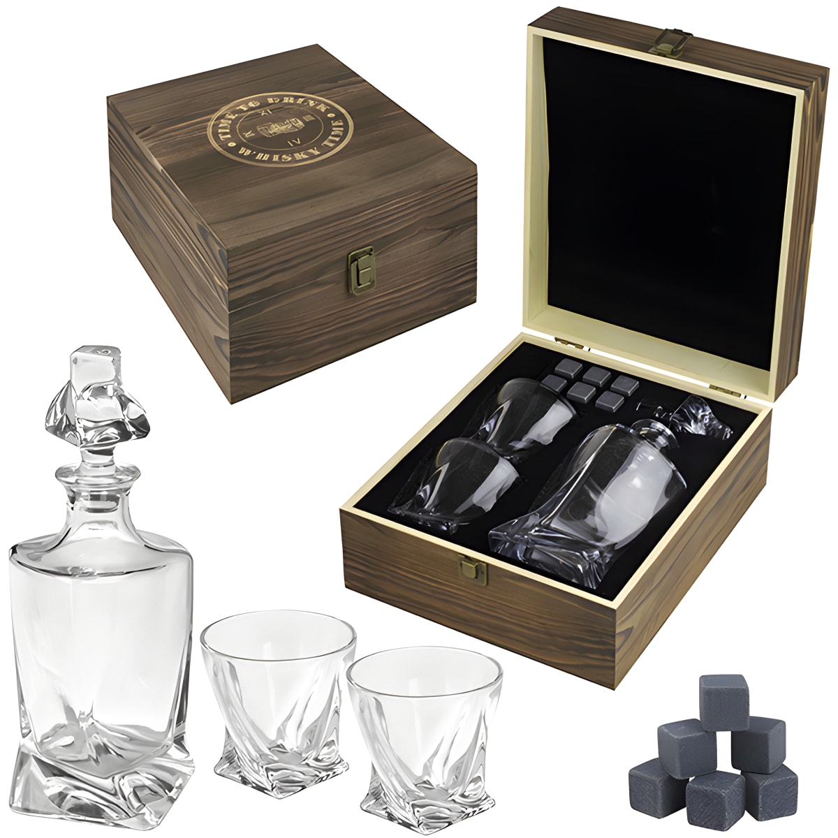מארז ויסקי יוקרתי עם דקנטר, כוסות ואבנים