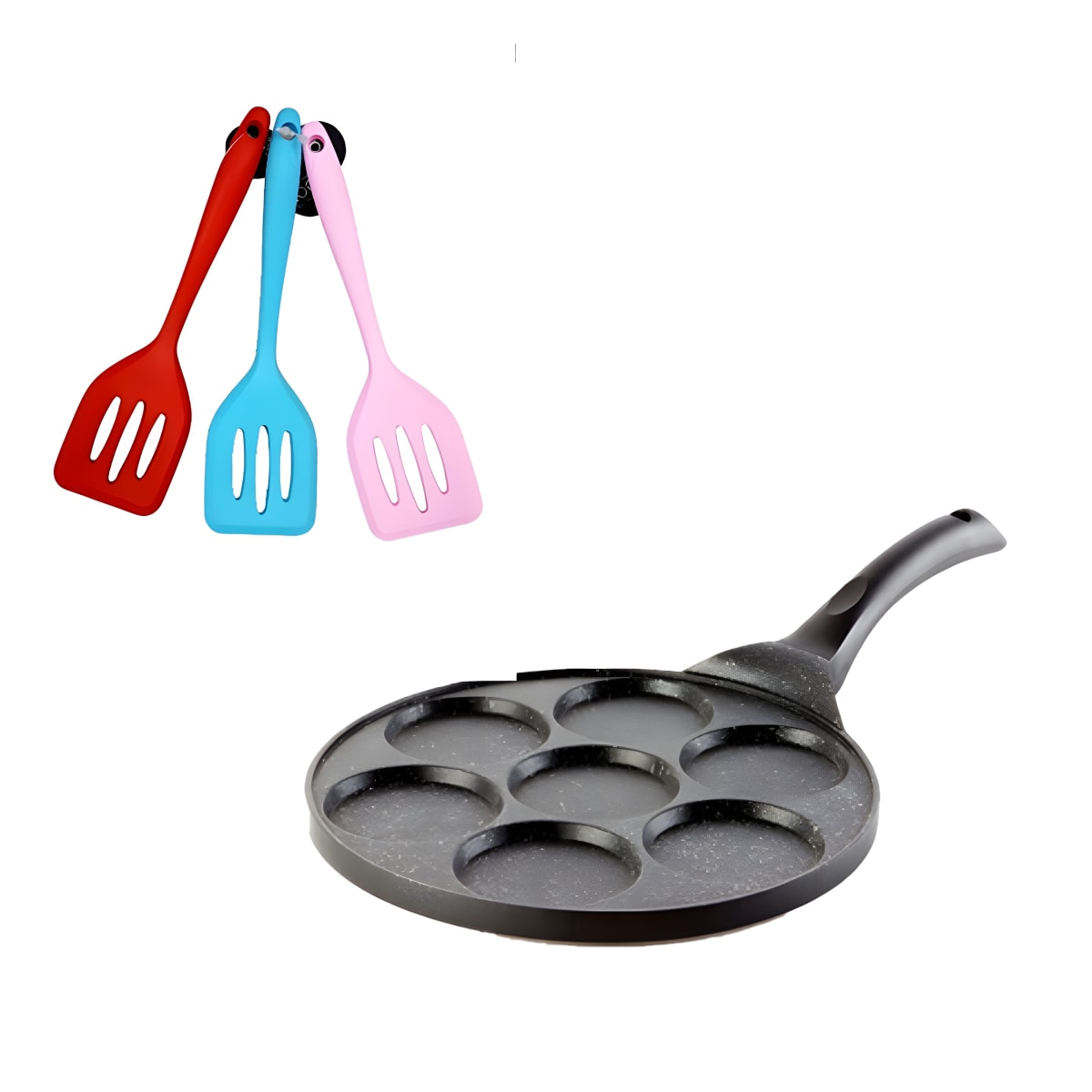 מארז מחבת לפנקייקים עם 7 שקעים ותרבד מיני צבעוני