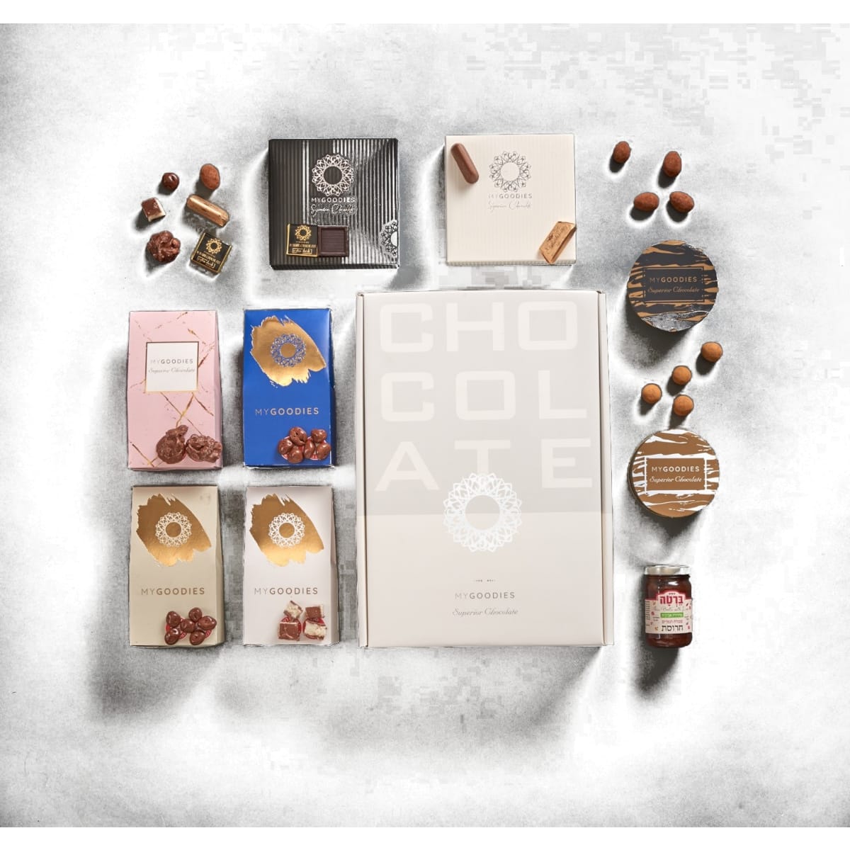 שהם - קופסת פח המכילה שקד בעיטוף שוקולד מריר, מובזק באבקת קקאו, שהם - קופסת פח המכילה לוז בעיטוף שוקולד חלב, מובזק באבקת קינמון,