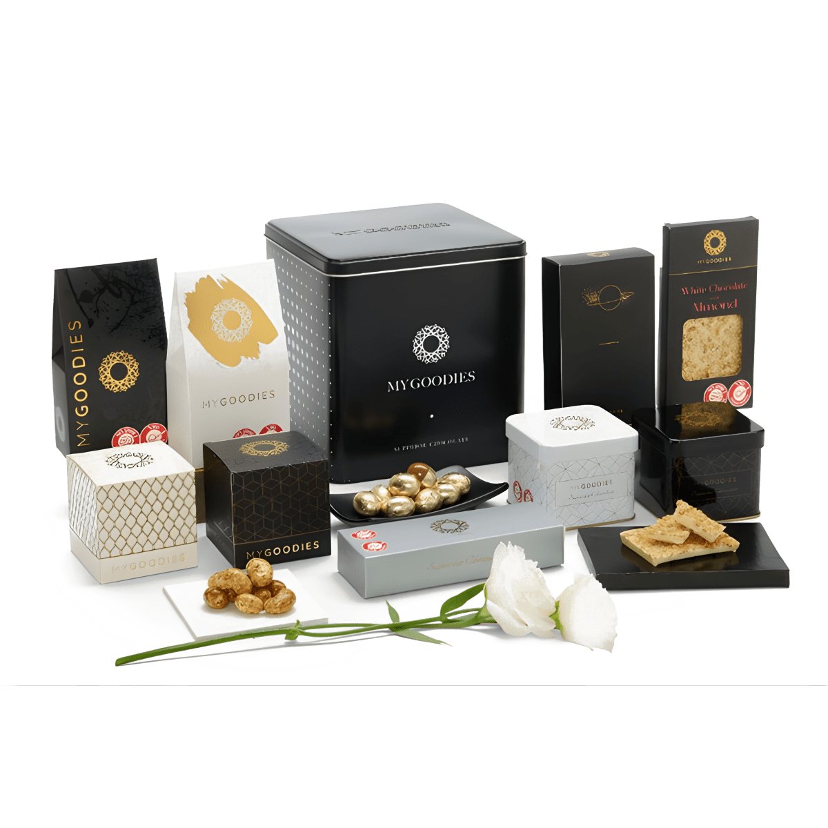 • ארגמן- קופסת פח המכילה קלסטרס קשיו, קרמל ומלח ים, אשכולות שוקולד חלב עם שברי קשיו, חתיכות קרמל ומלח ים