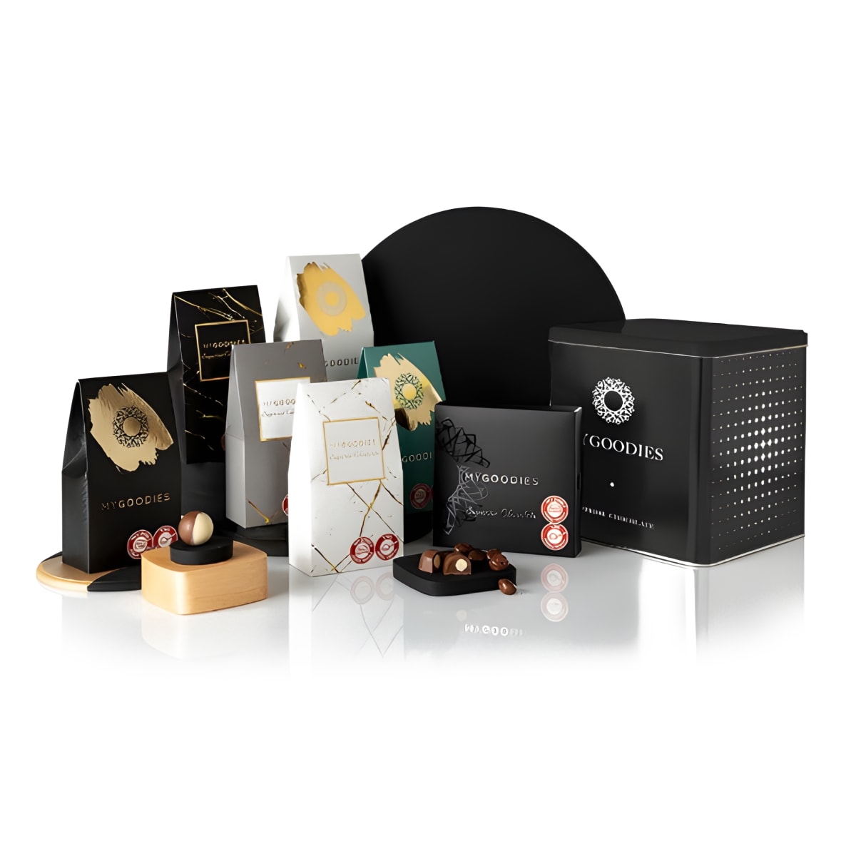 מארז סטאר שחור – קופסת פח המכילה :  ספיר- פרלין שוקולד חלב עם קרם קקאו ושברי פקאן סיני ספיר - פרלין שוקולד חלב עם קרם וניל ושבב