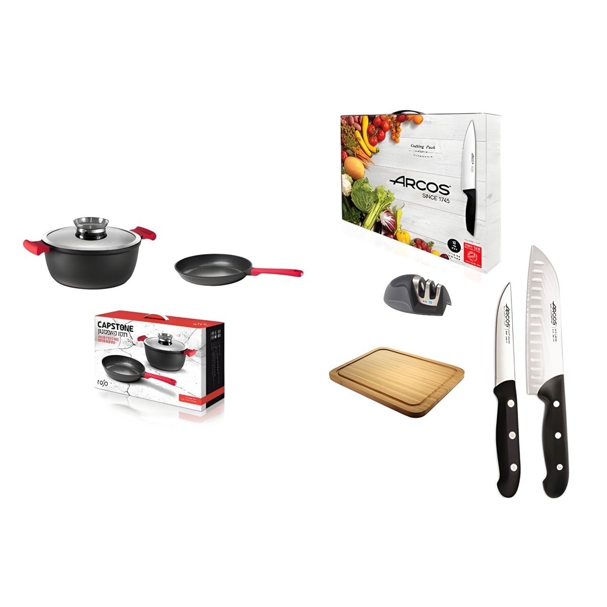 מארז סכינים יוקרתי של ARCOS עם משחיז וסירים ROSO