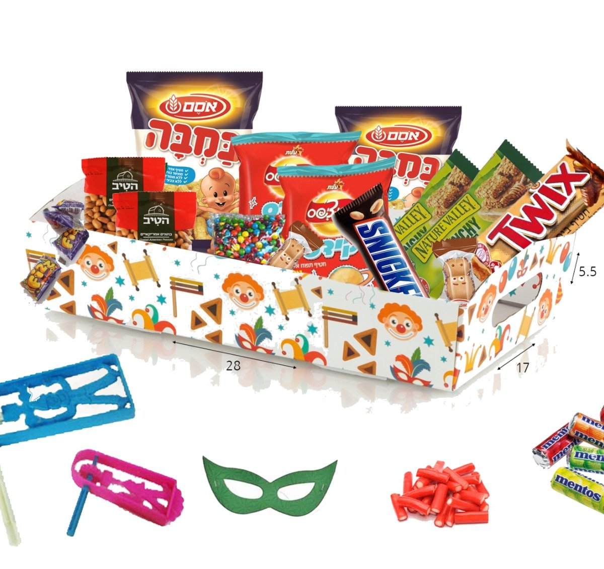 מארז פורים שמח ומבדח עם ממתקים ופריטים חגיגיים