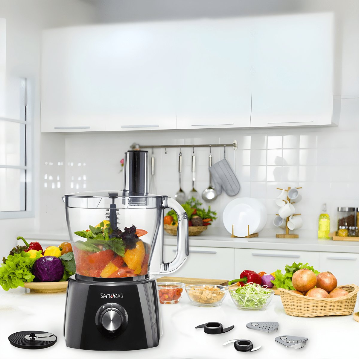 מעבד מזון עוצמתי מבית SAMURAI, מושלם לקיצוץ, פריסה וגרוד מזון בקלות. כולל מיכל עיבוד 3 ליטר, להב נירוסטה לקיצוץ, ו-3 דסקיות נירוסטה מיוחדות