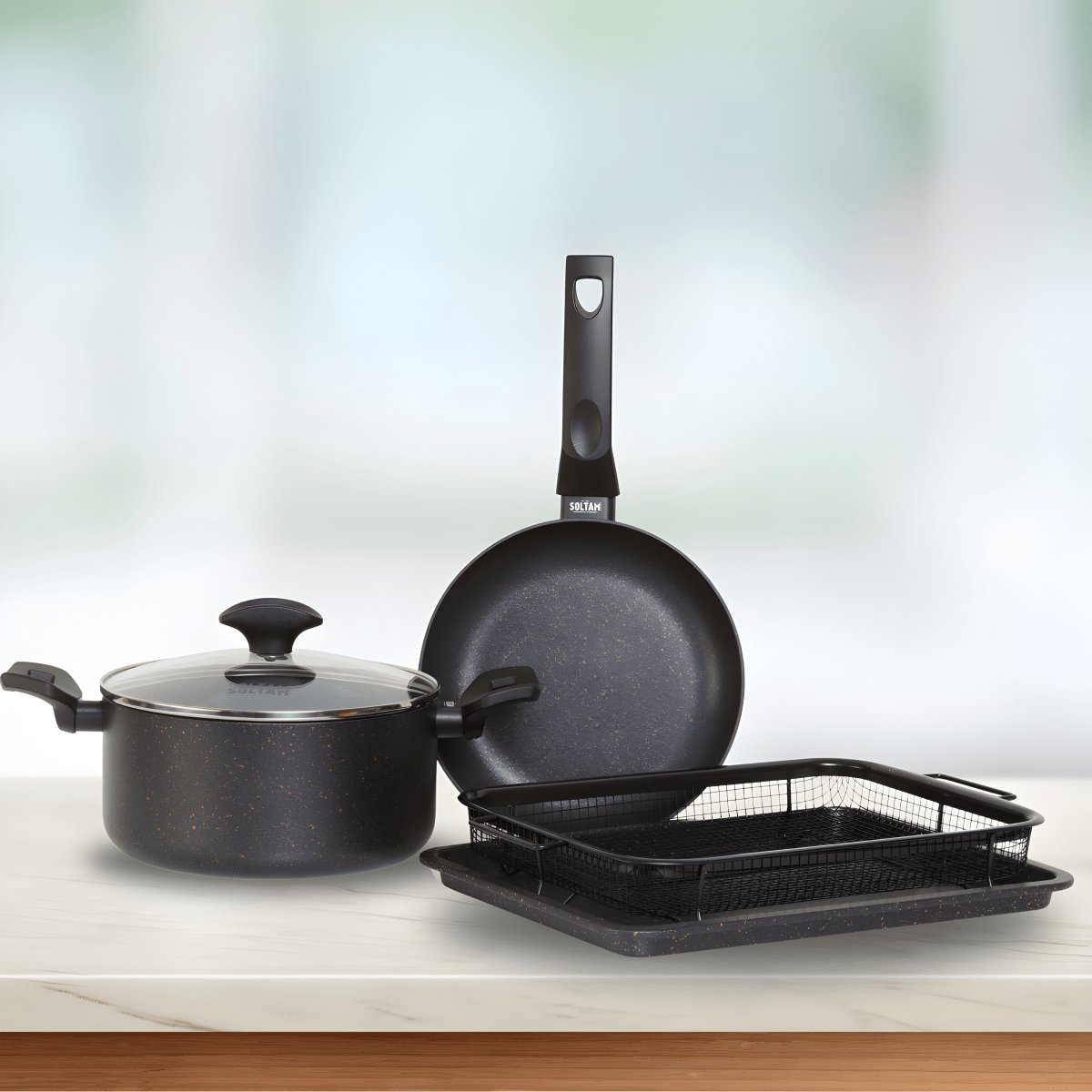 גלה את סט הבישול המתקדם מסדרת OPTIMA מבית SOLTAM - הכולל 5 חלקים איכותיים לבישול מושלם. עשוי מאלומיניום רב שכבתי עם ציפוי Non Stick דמוי שיש למניעת הידבקות המזון ולהפחתת השימוש בשמן.