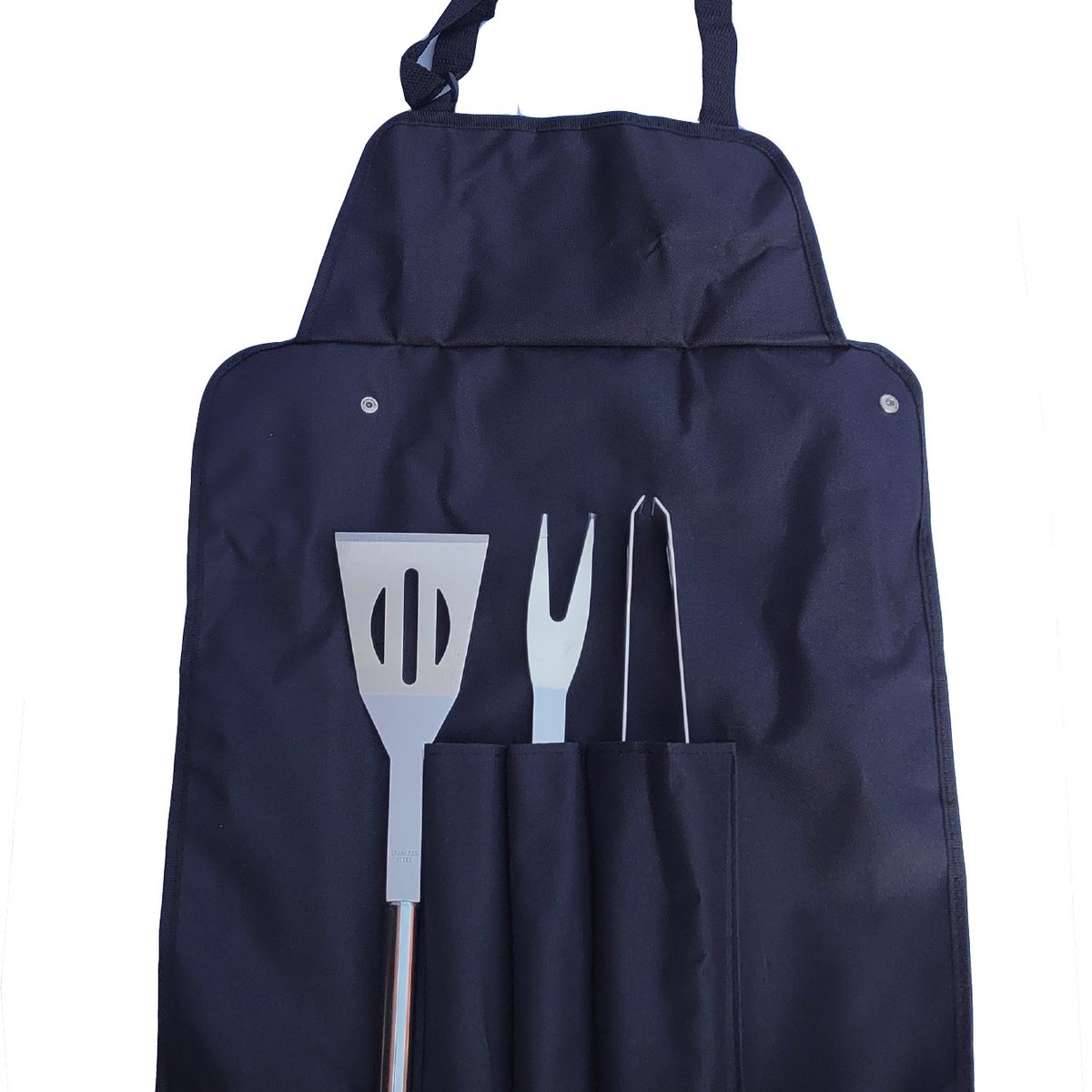 סט ברביקיו מושלם הכולל מזלג, מלקחיים ומרית עשויים ממתכת אל חלד עבה, המסודרים בכיסים נוחים בסינר גדול. הסינר כולל אבזם להתאמת אורך הרצועה לצו