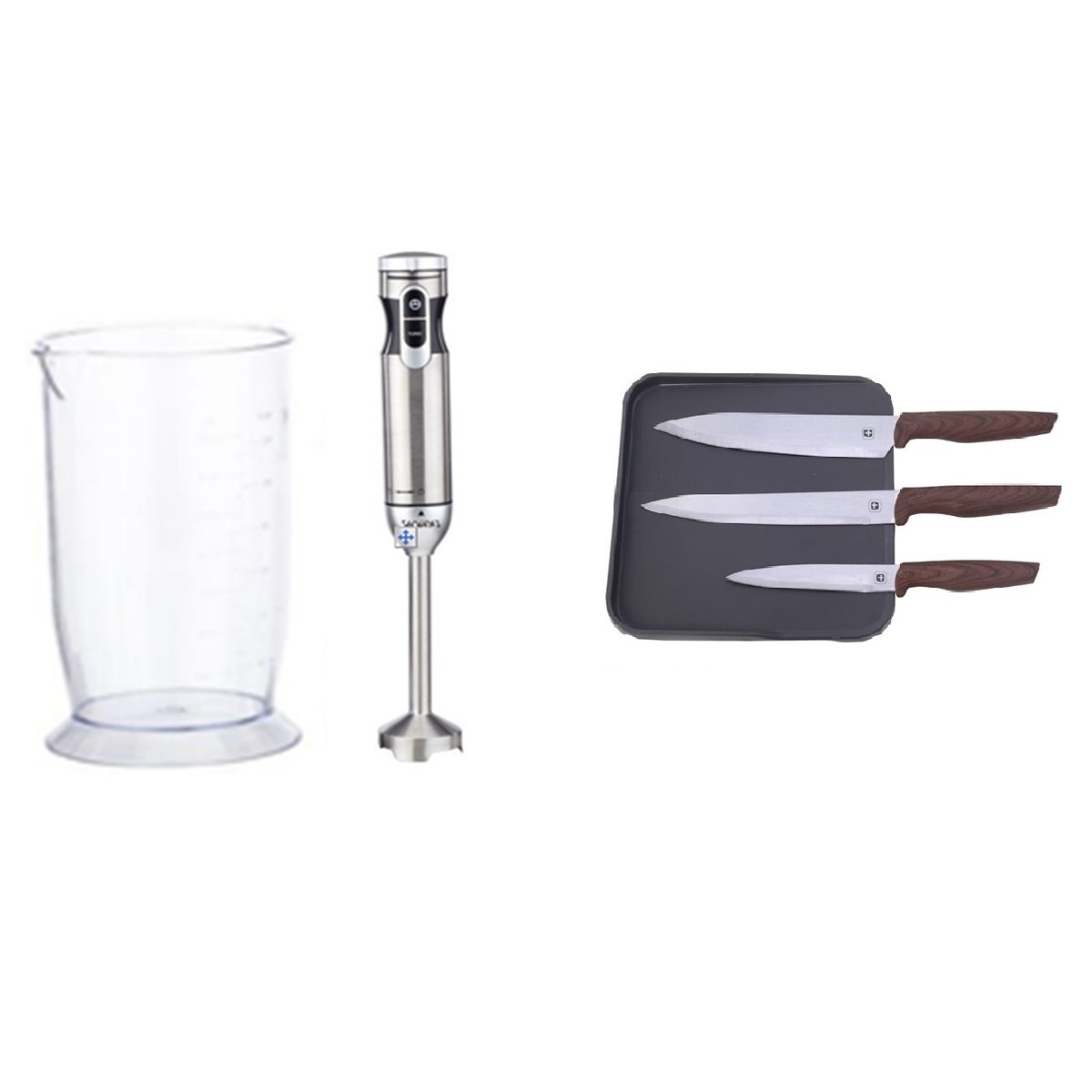 הכינו את המטבח שלכם עם סט מושלם הכולל בלנדר מוט חזק במיוחד עם הספק של 1000-800W ומיכל בנפח 700 מ"ל. בנוסף, קבלו סט של 3 סכיני שף עם ידית עץ