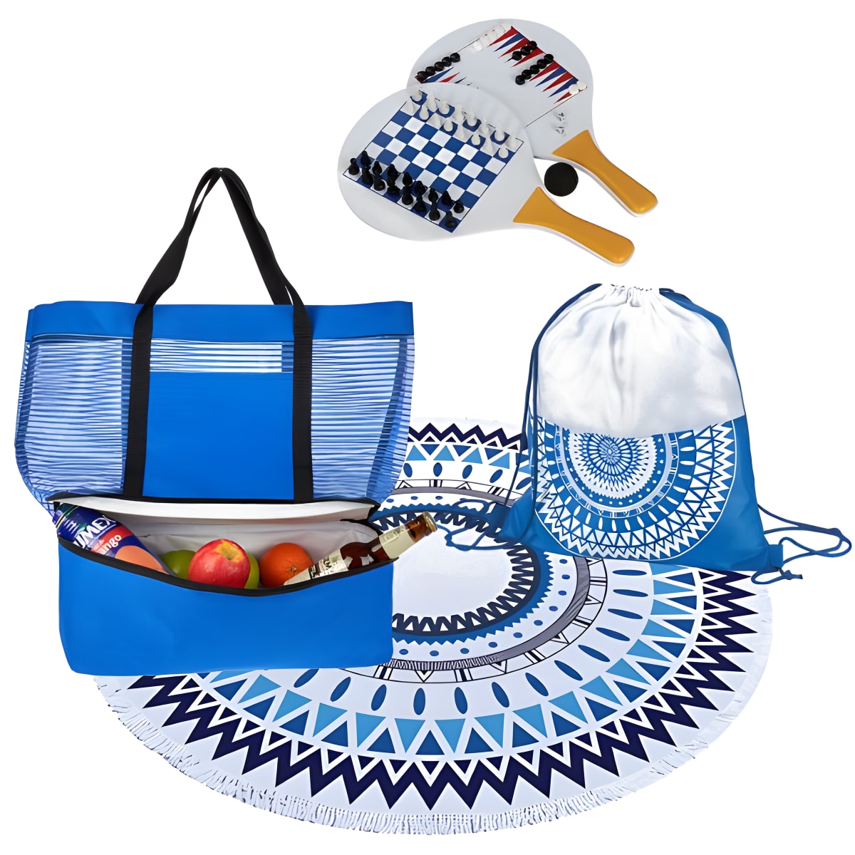 הערכה כוללת: תיק חוף משולב עם צידנית דגם 4718 מגבת חוף דרייפיט עגולה בנרתיק הנשיאה דגם 5016 סט משחקים לחוף מטקות עם ששבש ושחמט דגם 2159