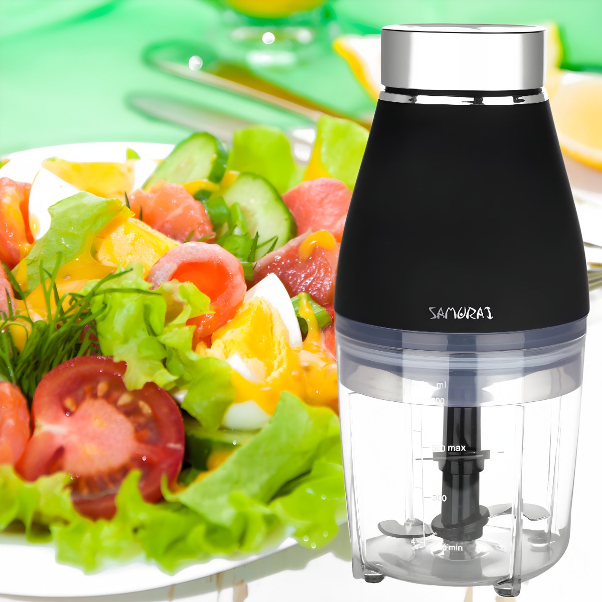 קוצץ מזון מקצועי על ידי SAMURAI עם 4 להבים חזקים לקיצוץ מגוון סוגי מזון בקלות ובמהירות. אידיאלי לחיתוך בצל, שום, עשבי תיבול, בשר, אגוזים ובי