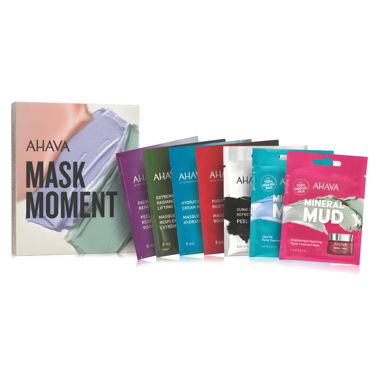Discover the amazing AHAVA facial mask kit, featuring 7 unique masks for renewing, cleansing, brightening, and perfect moisturizing of your