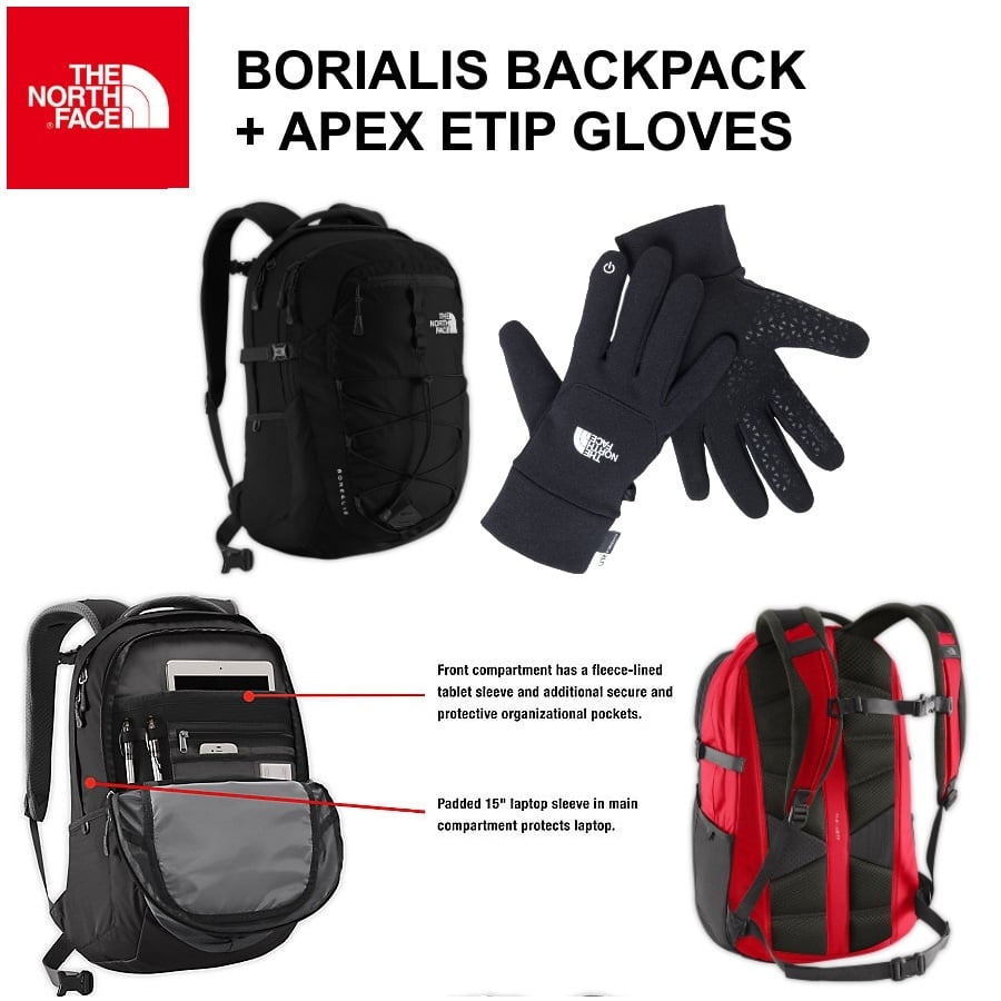 גלה את הציוד המושלם של THE NORTH FACE! סט תיק גב דגם בוריאליס וכפפות טאץ' מחממות ומעוצבות, שמספקות נוחות וביצועים גבוהים.