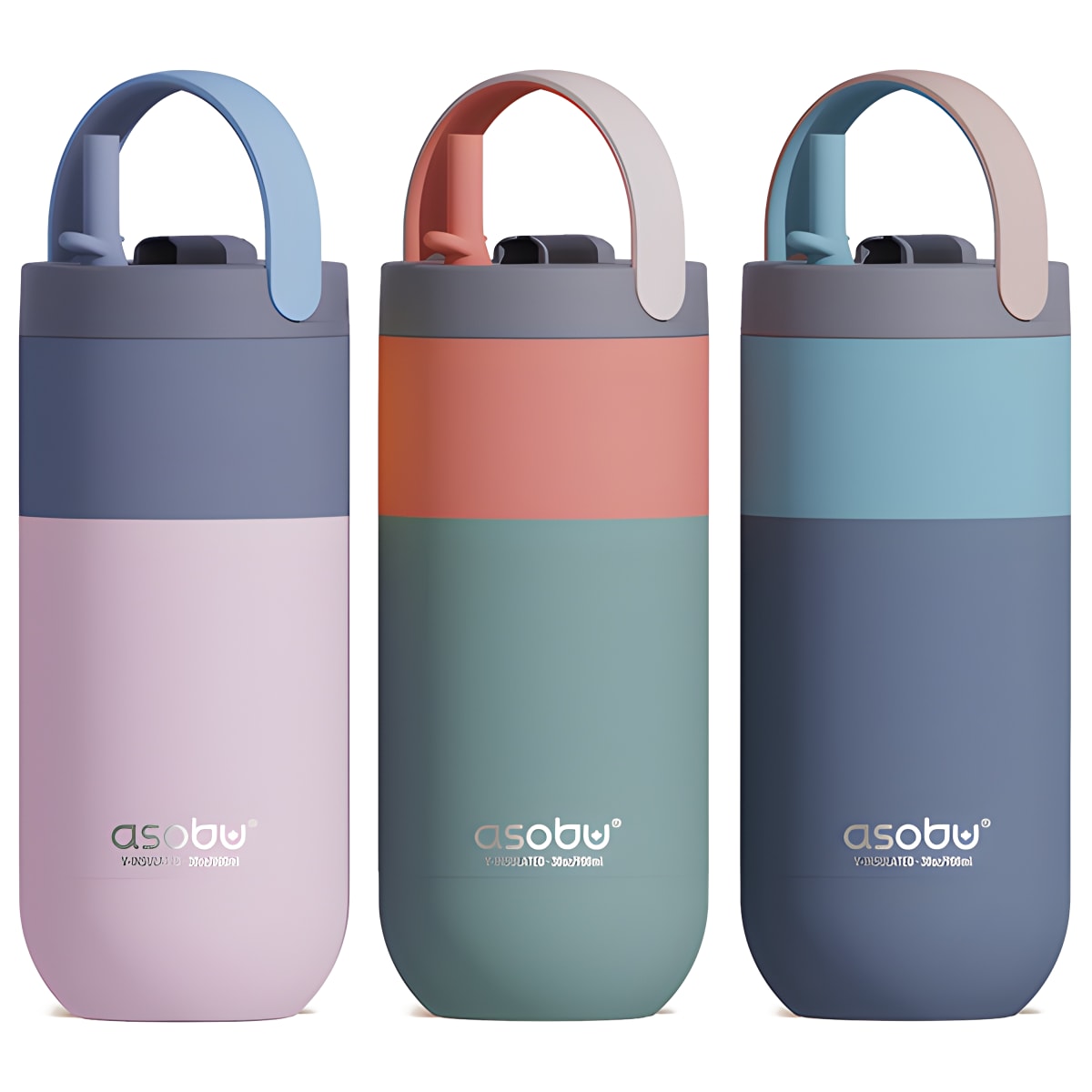 בקבוק תרמי אופנתי מבית ASOBU, מושלם לטיולים, ספורט ומשרד. שומר על חום וקור למשך שעות עם בידוד כפול ואטום לנזילות. זמין בצבעים ורוד-כחול, כחול-תכלת וירוק-כתום. עמיד ונוח לניקוי ידני.