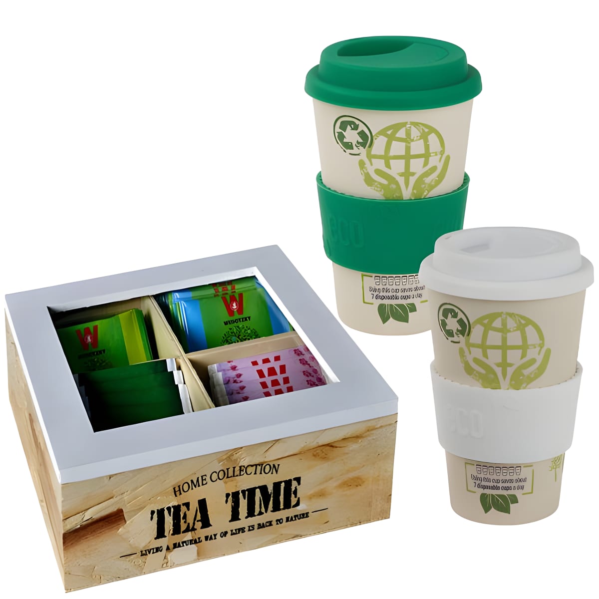Indulge yourself and your loved ones with a perfect tea brewing gift set. This set includes an elegant wooden box with 4 compartments (Model 4286) and 2 eco-friendly bamboo cups (Model 4767). The tea bags shown are for illustration only, and cups can be ordered in various colors based on stock availability. Enjoy a soothing cup of tea every day!