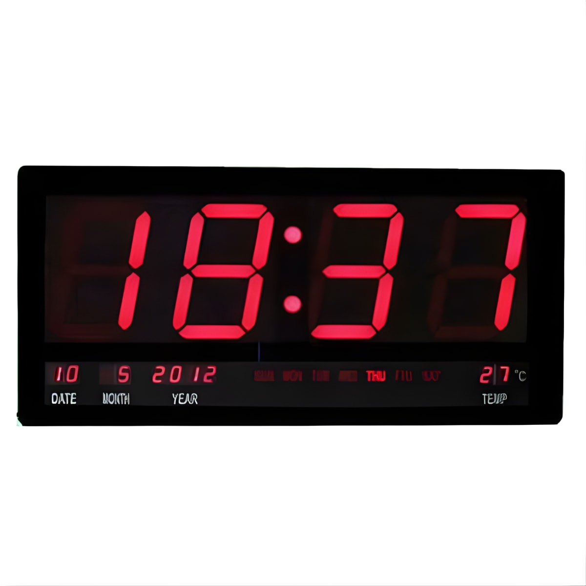גלה את שעון הקיר הדיגיטלי המתקדם עם תצוגת LED אדומה מרשימה. כולל לוח שנה יומי, חודשי ושנתי יחד עם מד חום מובנה. השעון שומר נתונים גם לאחר הפ