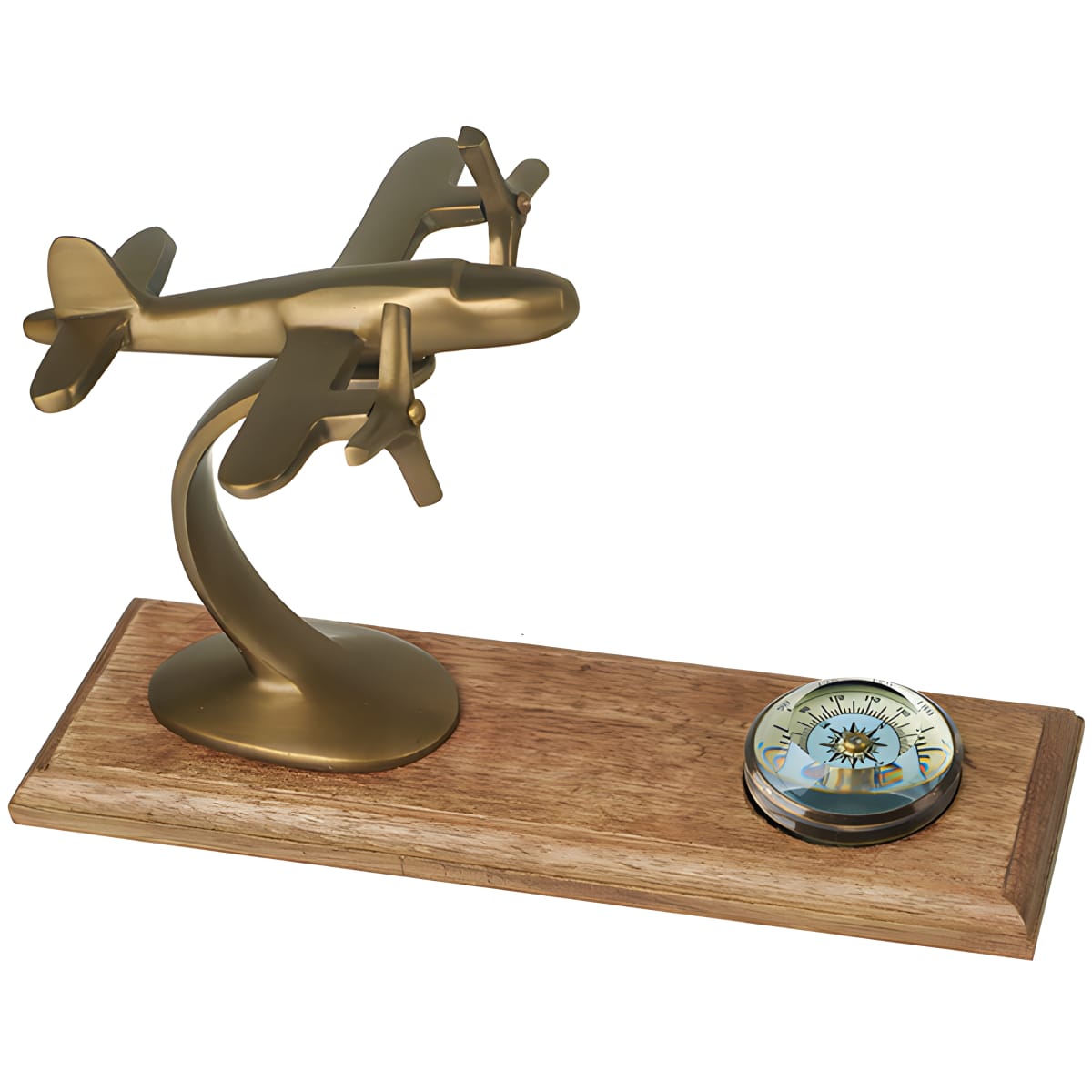 מעמד שולחני מעוצב מטוס נחושת עם מצפן על בסיס עץ