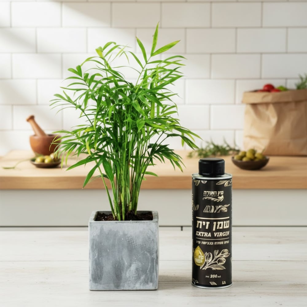 The "Spring Has Arrived" gift set offers an unparalleled gifting experience. The Freedom Plant potted in a stylish 9 cm concrete pot provides a natural touch symbolizing growth and renewal. Additionally, the 200 ml bottle of high-quality olive oil from Moshav Etz HaSadeh offers a rich and exquisite taste from the local agriculture. With this gift set, you can provide the perfect corporate gift that will leave a lasting impression on your employees and clients.