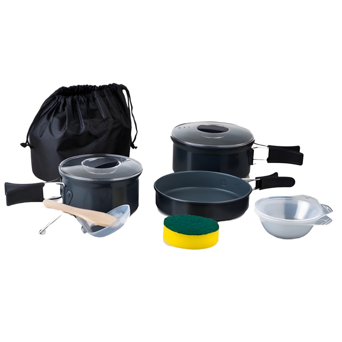 תוכן הסט כולל את כל מה שצריך לחוויית בישול מושלמת בטבע: סיר גדול בגודל 85×160 מ”מ, סיר נוסף בגודל 75×135 מ”מ, מחבת איכותית בגודל 40×170 מ”מ, שלוש קעריות לנוחות מושלמת כל אחת בגודל 39×113 מ”מ, כף חלוקה, כף בישול וסקוץ' לניקוי קל. מושלם לכל בשלן חוץ חדור מוטיבציה. כלי אוכל קלים לנשיאה ומוכנים לשימוש בכל טיול.