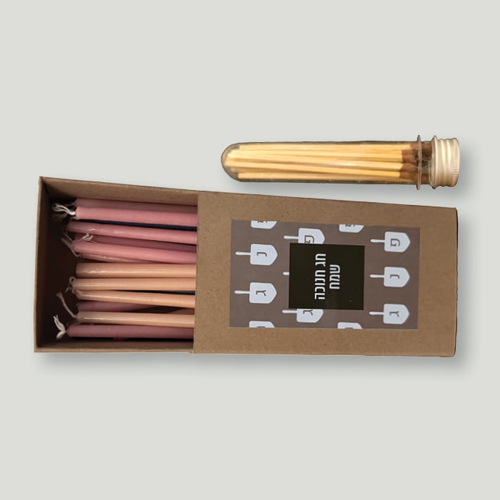 סט נרות חנוכה עם מבחנת גפרורים ממותגת