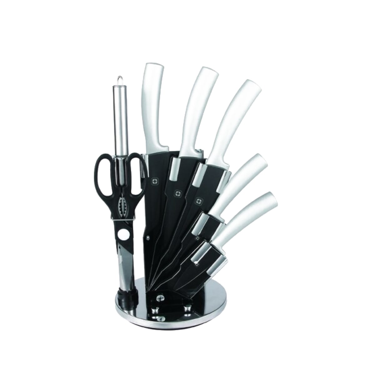 Discover the luxury chef knife set by POLOSWISS, featuring 8 pieces: 5 sharp chef knives, a sharpener, and scissors. The set includes a convenient rotating desktop stand. The knives are crafted from stainless steel with a special non-stick coating, ensuring long-lasting blade life, high sharpness, and corrosion resistance. The knife handles are reinforced and stable, and the entire set comes in a luxurious gift box. Box dimensions: 39X34X53 cm.