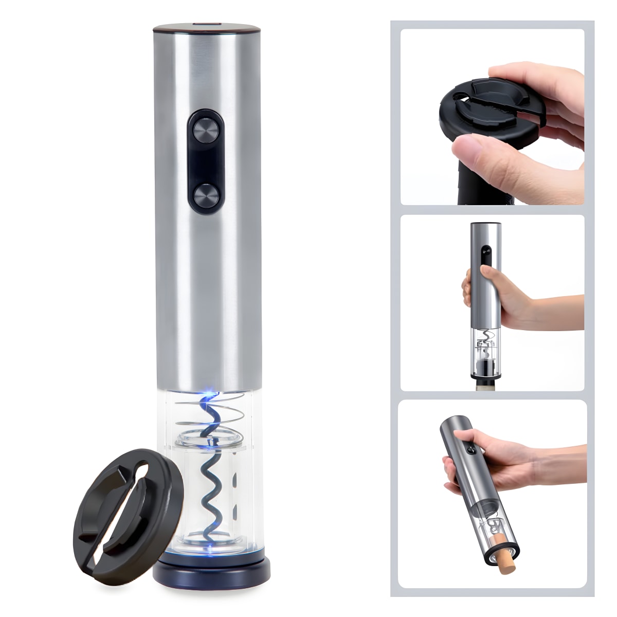 פותחן יין חשמלי עם גימור מתכת יוקרתי ותאורת LED לשימוש נוח וקל.