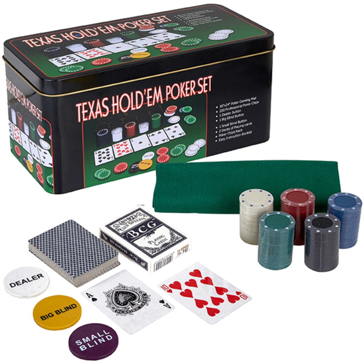 גלה את ההנאה האולטימטיבית במשחק פוקר עם הסט המושלם הכולל 200 ז'יטונים איכותיים, כל אחד במשקל 5 גרם. הסט כולל ז'יטון דילר (לבן), ז'יטון ביג בליינד (צהוב) וז'יטון סמול בליינד (סגול), מתקן לז'יטונים, 2 חפיסות קלפים ומפת משחק לשולחן בגודל 60x48 ס"מ. הסט מגיע במארז פח נוח לאחסנה ונשיאה, עם הוראות משחק באנגלית. אידיאלי למתנה יוקרתית לחובבי פוקר אמיתיים.