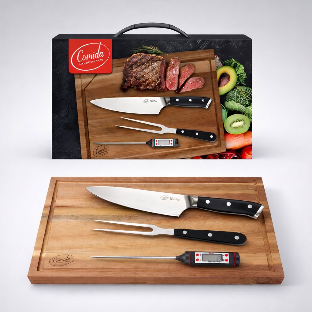 גלה את סט כלי המטבח הכולל שלנו עם סכין סנטוקו מעולה, מדחום למידת בישול מדויקת, קילשון בשר מקצועי ולוח חיתוך עץ אקציה עם שוליים משופעים. סט ז