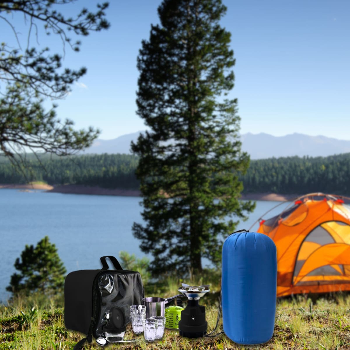 Enhance your camping experience with a professional camping set that includes a single sleeping bag and a POLOSWISS coffee kit, complete wit