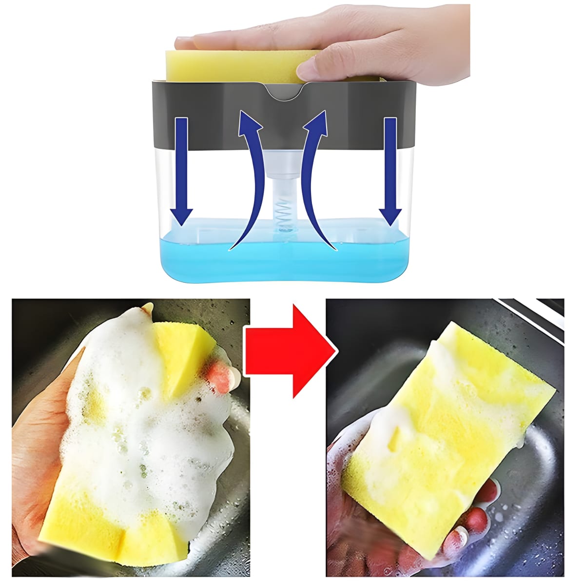 תשדרגו את חוויית ניקוי הכלים שלכם! הניחו את ספוג השטיפה על גבי הדיספנסר, לחצו בעדינות, והנוזל ישתחרר בקלות. דיספנסר הנוזל החכם ימשוך את נוזל הכלים באופן אוטומטי, לשימוש נוח ויעיל.