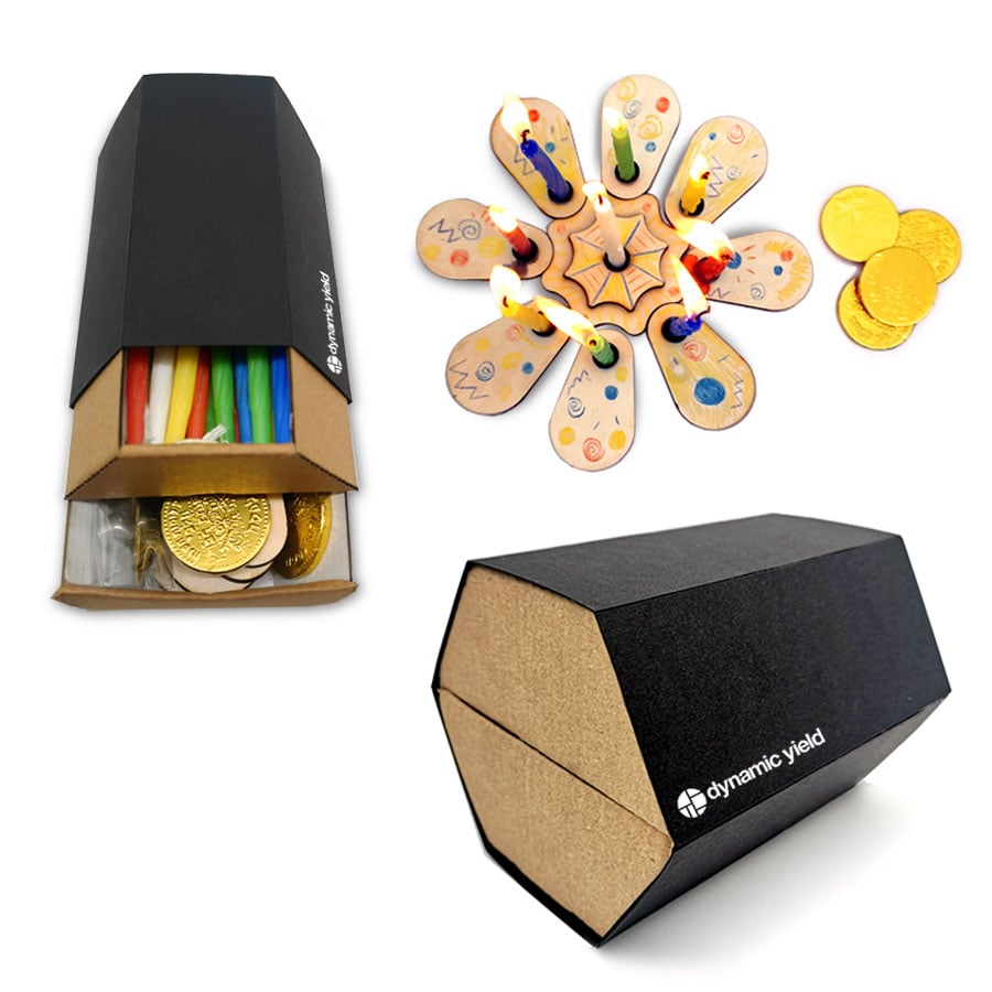 Create unforgettable memories with our Hanukkah Creativity Kit! The kit includes a wooden menorah for painting and assembly in a floral design, 44 colorful candles, 9 menorah holders, and 4 chocolate coins. The package is made of high-quality cardboard and can be branded with a single color on the packaging or in a colorful packaging for an additional fee. Package size: 12X12X14 cm. Minimum order: 100 packages. Surprise your loved ones with an exceptional gift!
