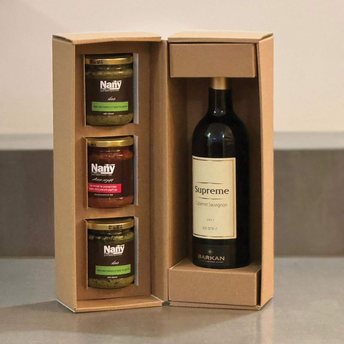 חוויית טעמים מושלמת עם מארז הכולל בקבוק יין איכותי ושלושה ממרחים טעימים: פסטו רענן, עגבניות מיובשות עשירות וטפנד זיתים משובח. המארז המושלם ל
