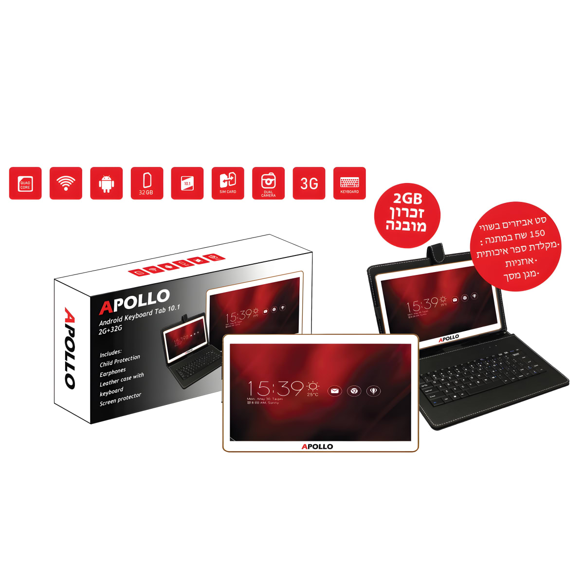 טאבלט אנדרואיד 10.1 אינץ' עם מקלדת ואביזריםמאפייניםתצוגת IPS בגודל 10.1 אינץ'נפח זיכרון של 2GB ואחסון 32GBפונקציות כולל הגנת ילדים ומצלמות כ