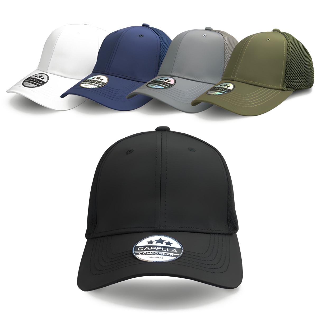 כובע אופנתי ואיכותי מבית CAPELLA עם 6 פאנלים ורצועת גומי פלקס, מושלם לשילוב סטייל ונוחות. כובע חצי רשת מעניק אוורור נוסף, מתאים לשימוש יום-י