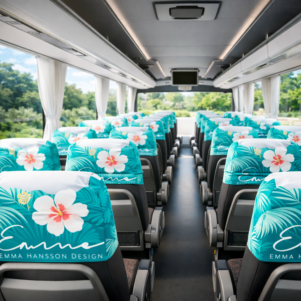 שדרגו את חווית הנסיעה שלכם עם כיסוי מושב לראש, מבד  לייקרה מודפס בהתאמה אישית, מתאים לאוטובוס, מטוס, אולם אירועים , קולנוע, רכב ועוד. כיסוי זה מציע נוחות מירבית ומראה מרשים בכל נסיעה. עשוי מבד לייקרה איכותי, עם הדפס צבעוני מלא על כל שטח הבד, לפי גרפיקה של הלקוח . התאמה מושלמת ועמידות לאורך זמן. אידיאלי לאירועי חברה, נסיעות לקבוצות ,