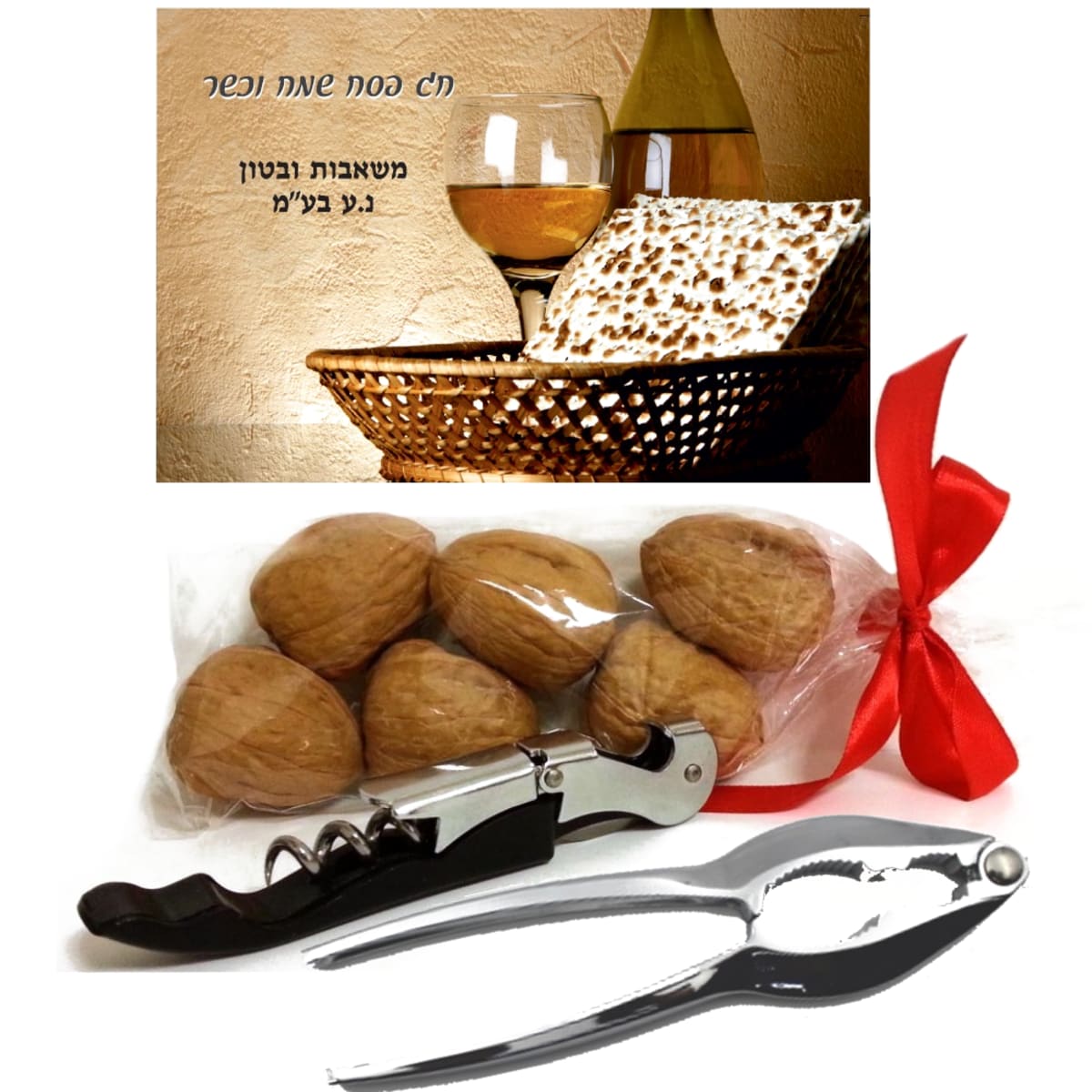 כרטיס ברכה לפסח ייחודי עם הלוגו של החברה שלך כולל פותחן יין, קליפת אגוזים ו-6 אגוזי מלך. אופציה לשדרוג לפותחן אגוזים פרימיום. *** עלות עיצוב