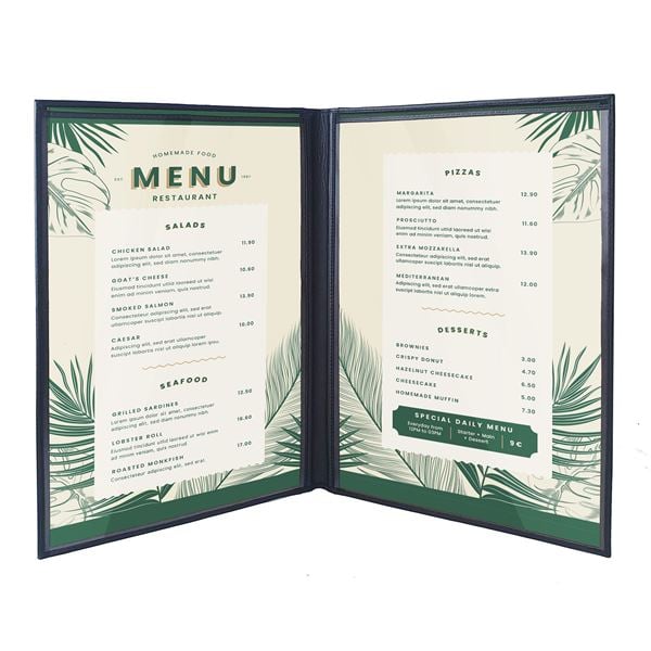 היפכו את תפריט המסעדה שלכם למרשים ומסודר עם כריכת תפריט מעור איכותי. מכיל שני כיסים פנימיים לנוחות מקסימלית. מתאים לגודל A4. בחירה מושלמת לב