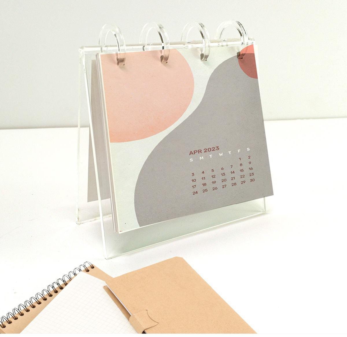 לוח שנה עשוי מפלסטיק שקוף עם 4 טבעות ספירלה אקריליות. כולל 13 כרטיסיות ממותגות בגודל 11*11*4 ס"מ. הדפסה צבעונית על דפי לוח השנה. מגיע באריזת