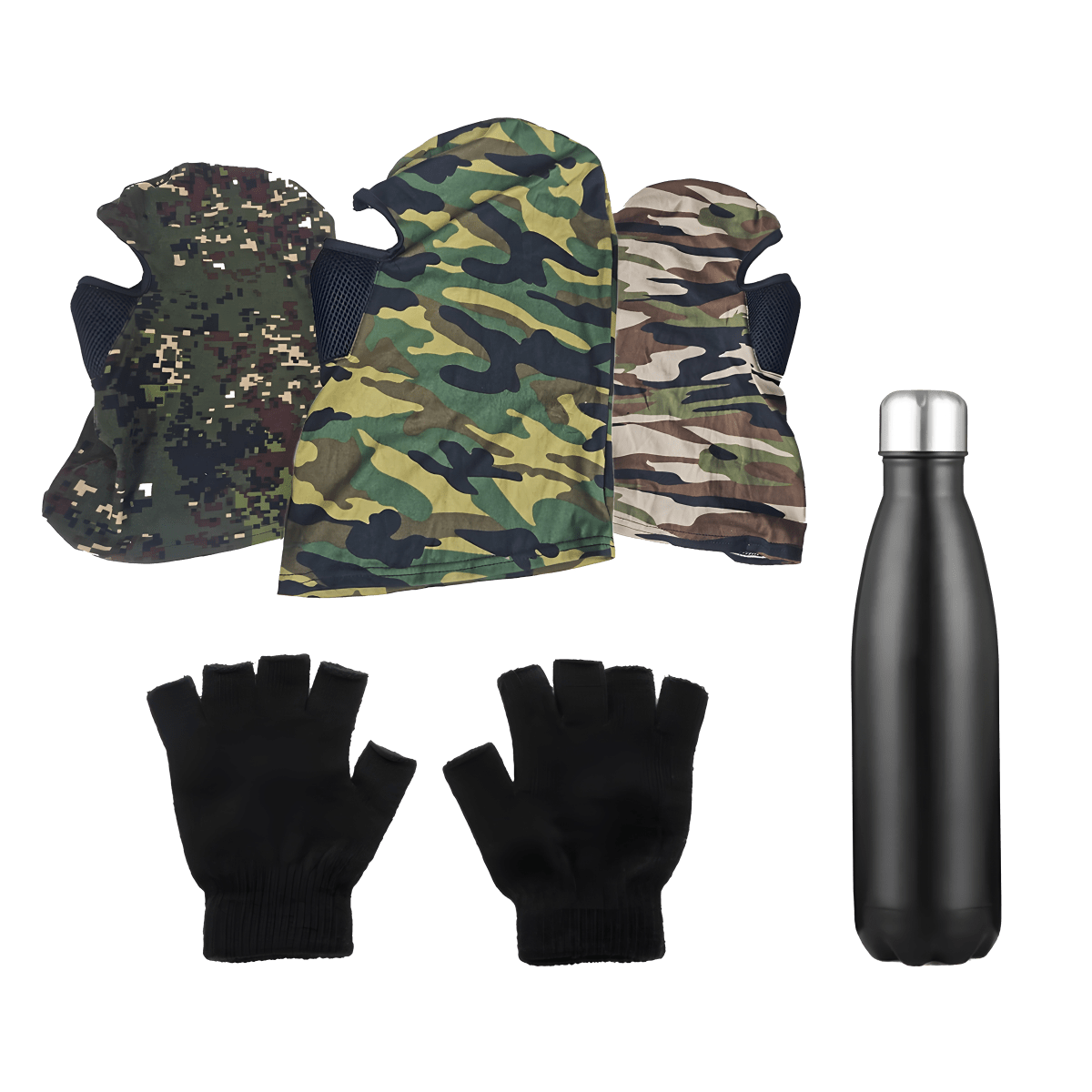 מארז החיילים המנצח בנוי במיוחד עבור חיילים בשטח, המארז כולל: מסכה טקטית איכותית להבטחת נוחות והגנה כפפות חצי צמר לשמירה על חום וטיפול בקבוק