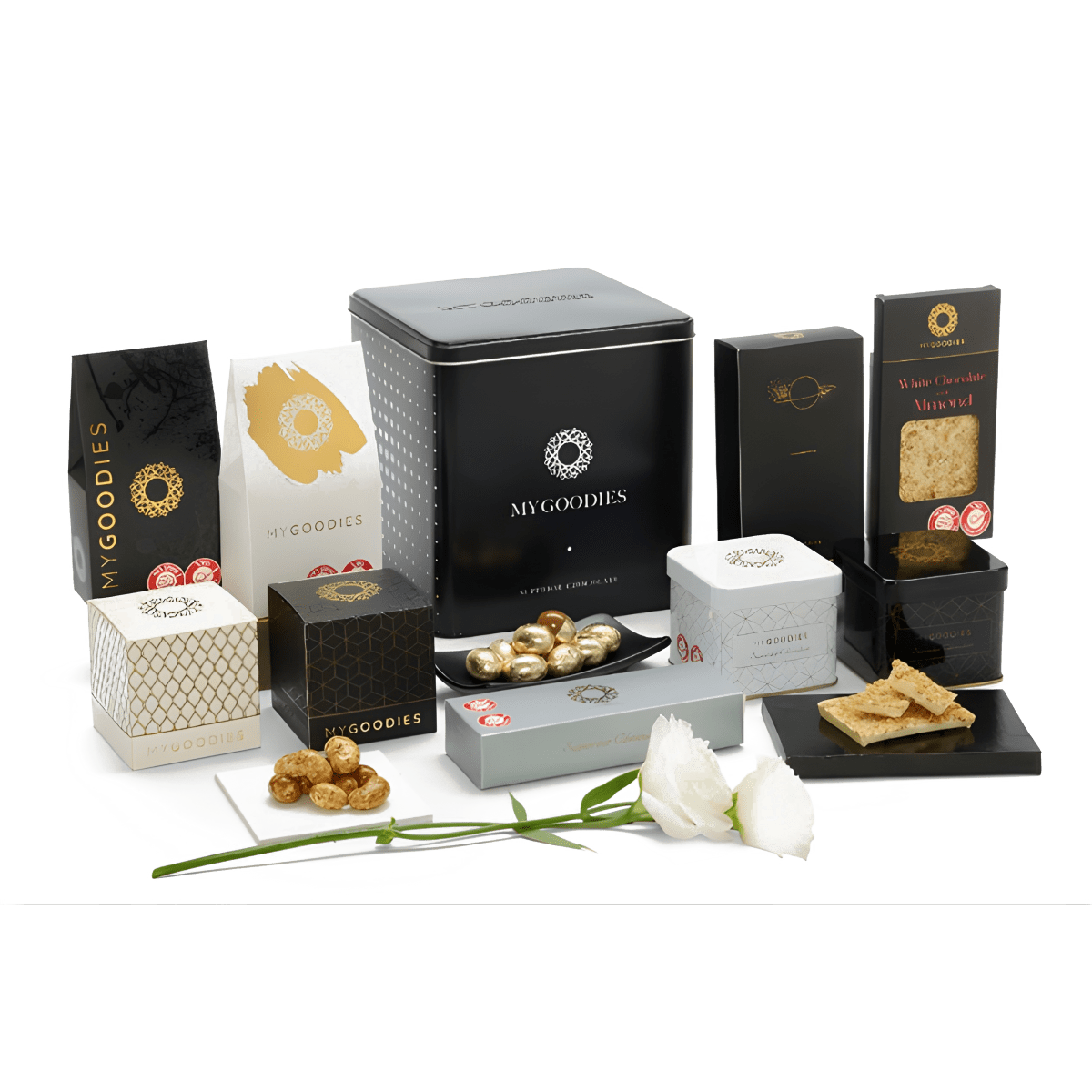 • ארגמן- קופסת פח המכילה קלסטרס קשיו, קרמל ומלח ים, אשכולות שוקולד חלב עם שברי קשיו, חתיכות קרמל ומלח ים