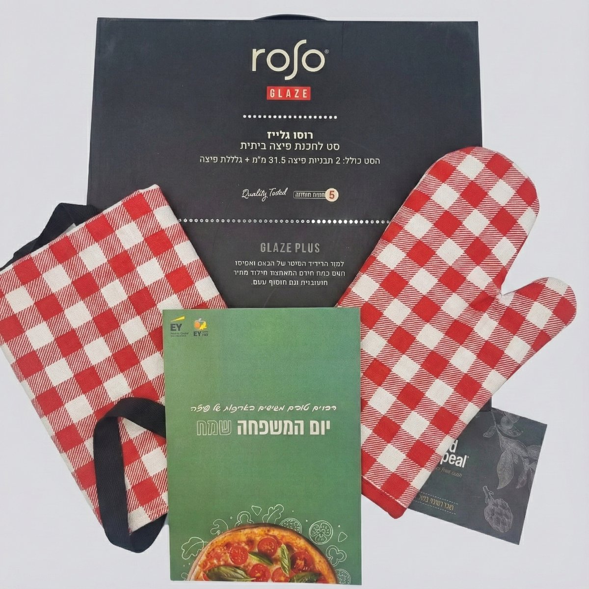 מארז פיצה משפחתי מושלם הכולל סינר צבעוני במיתוג מלא, כפפת מטבח מותאמת אישית, וסט פיצה 3 חלקים: אבן שמוט בקוטר 33 ס"מ, מעמד הגשה נירוסט
