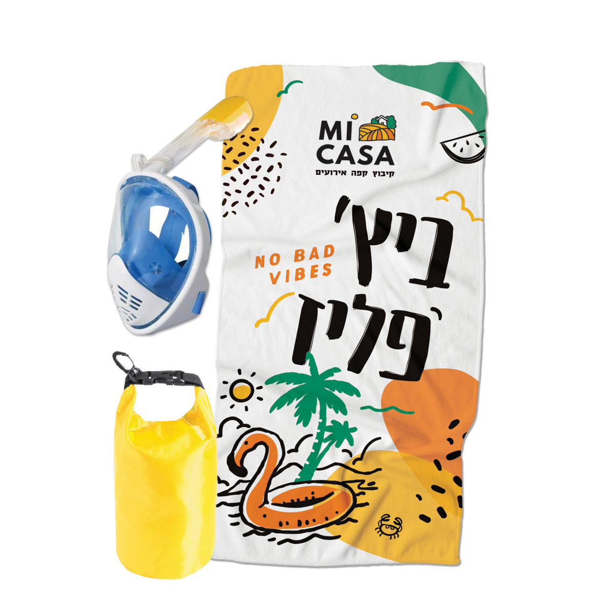 מארז צלילה מושלם למתחילים כולל כל מה שצריך לחוויה מושלמת בים: מגבת חוף ממותגת, מסכת צלילה Full Face עם שנורקל ותיק נגד מים לחפצים אישיים. המ