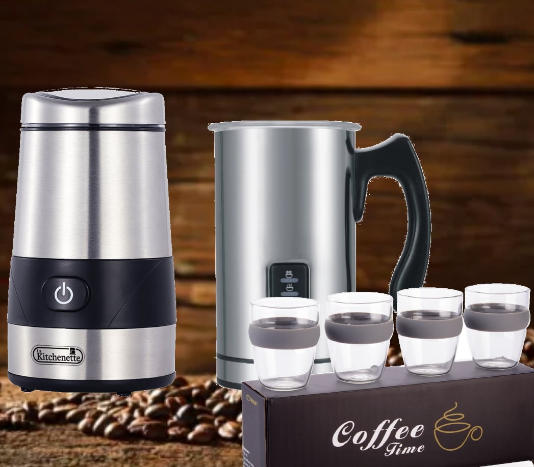 Luxury Coffee Set: Coffee Grinder and Smart Milk Frother by 'Moshe Segev' with Cups