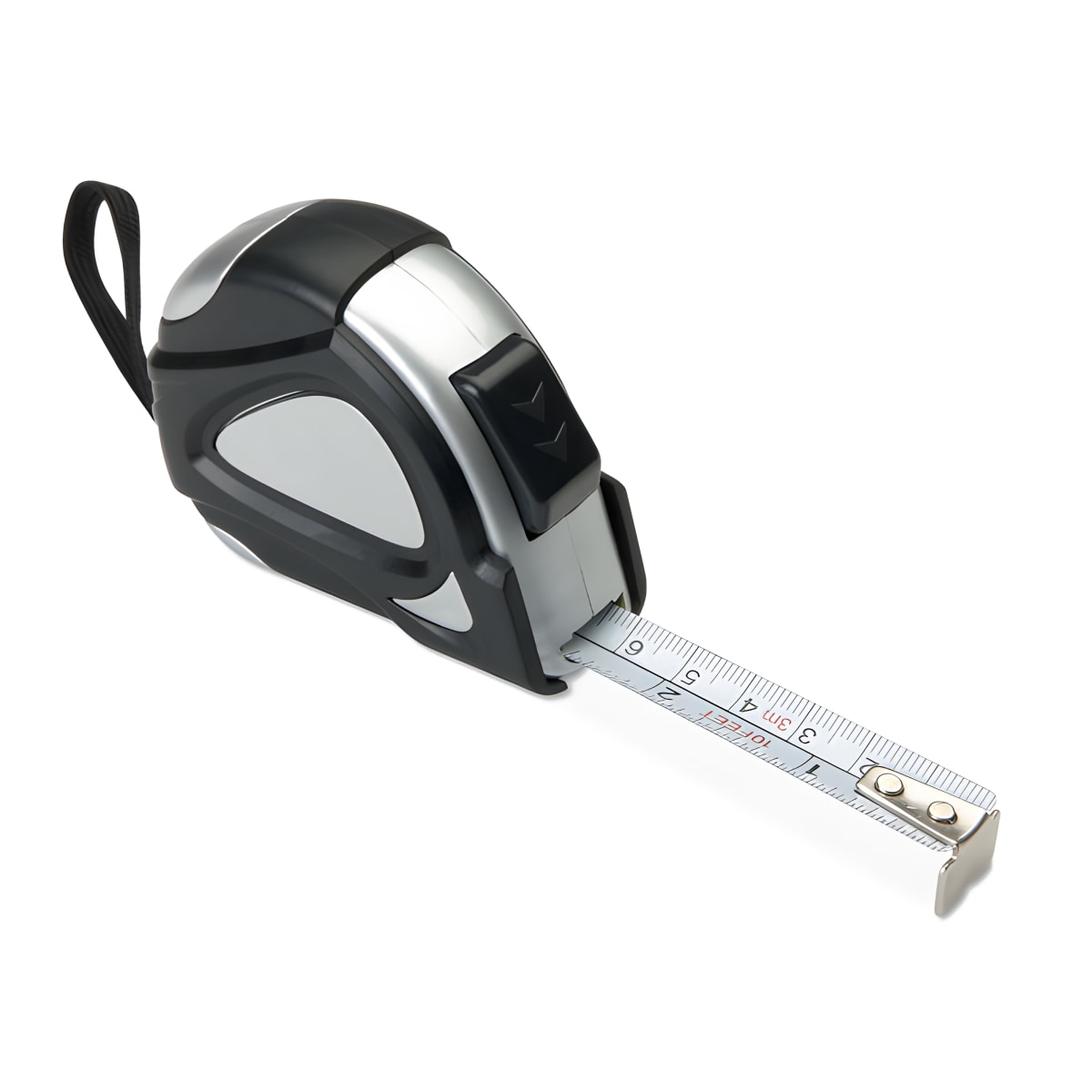 מדיד מקצועי 3 מטר במארז מתכת כסוף כולל רצועת יד וקליפס מתכתי מבריק. אידיאלי למדידה מדויקת ונוחה לכל עבודה ובנייה.