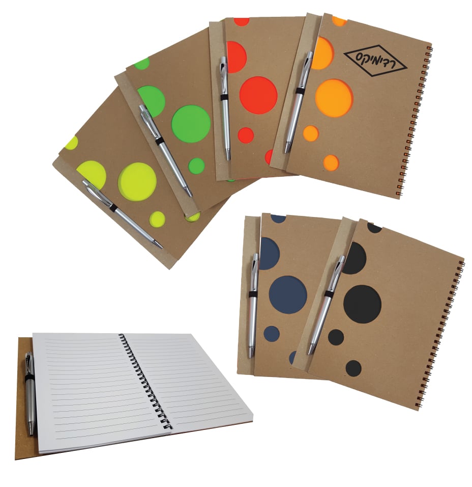 המחברת הספירלית האקולוגית עם כריכה קשה מציעה עיצוב ייחודי עם חיתוכים. כוללת 72 עמודים רגילים ועת כתיבה מפלסטיק כסף. מידות: 21x16 ס"מ. זמינה במגוון צבעים: כחול, שחור, כתום, צהוב, ירוק, אדום. מחיר אינו כולל מיתוג על עט.