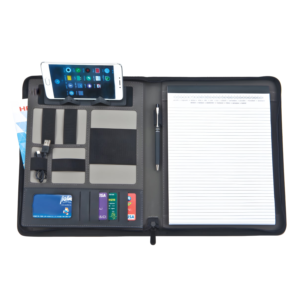 מכתביה A4 מהודרת עם רוכסן לשמירה על המסמכים שלך. כוללת תאים לכרטיסי ביקור ואחסון מסודר. בלוק ניירות שורה לכתיבה נוחה ומעמד לטלפון נייד. מצוי